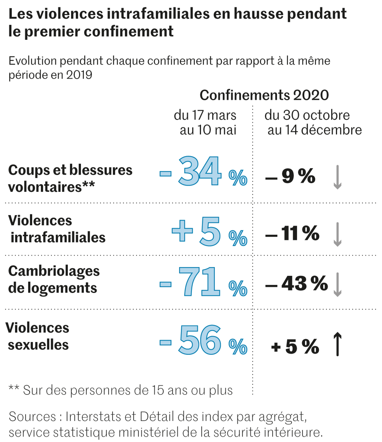Le bilan annuel de la délinquance présenté jeudi 28 janvier par le ministère de l’intérieur illustre les particularités d’une année 2020 marquée par deux longues périodes de confinement, du 17 mars au 10 mai, puis du 30 octobre au 14 décembre, entre promiscuité inédite, occupation quasi constante de lieux d’habitation et mobilité considérablement réduite. Le tableau chiffré des infractions dressé par le Service statistique ministériel de la sécurité intérieure (SSMSI) rend logiquement compte des conséquences de ces épisodes. Il confirme également, sans surprise, une indiscutable tendance de fond : la recrudescence des violences intrafamiliales, redoutée des associations de prévention et de défense des victimes dès l’annonce du premier confinement, le 16 mars 2020.