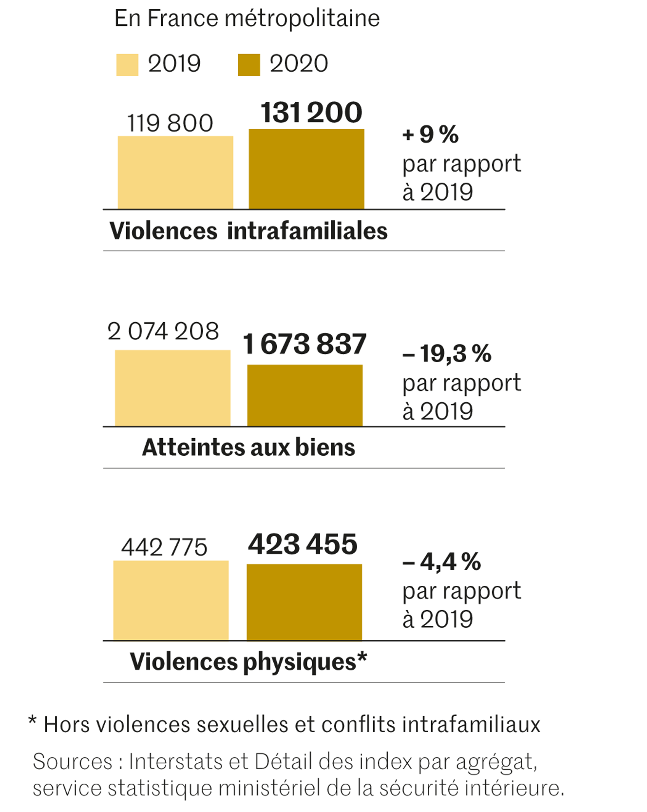 C’est sous cette dénomination que la nomenclature officielle recense les mauvais traitements, abus divers, atteintes à l’intégrité physique ou à la dignité, chantages perpétrés dans le cercle familial, à l’encontre de mineurs ou de majeurs, que leur auteur ait ou non quitté le ménage. Déjà en augmentation depuis l’été 2019, conséquence probable du Grenelle des violences conjugales, qui « a pu inciter les victimes à davantage déposer plainte et favoriser un meilleur accueil par les services de sécurité » d’après le ministère de l’intérieur, ces infractions ont affiché en 2020 une nette hausse de 9 %, avec 131 200 faits constatés.