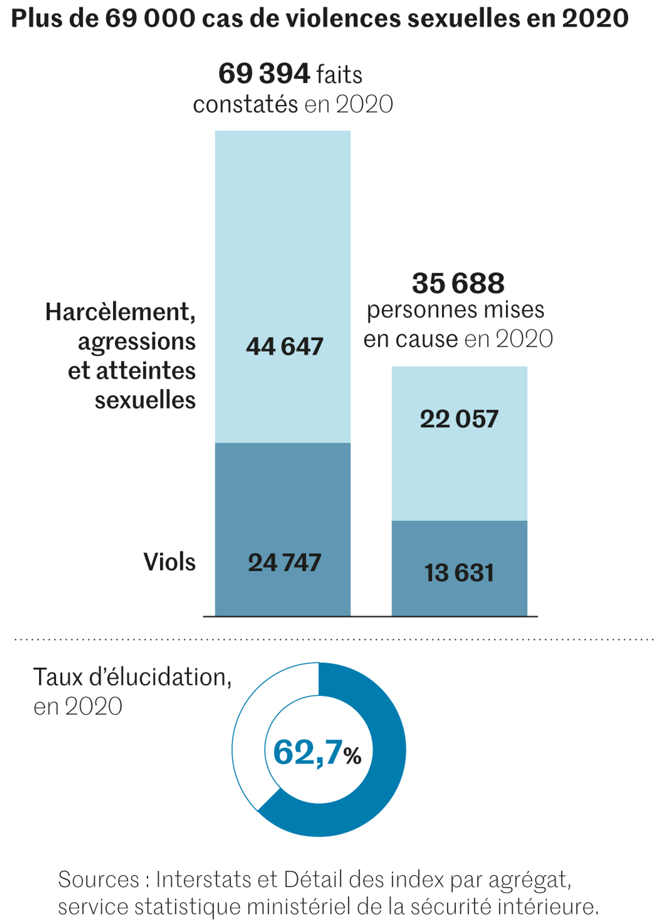 Aussi le total de 69 394 cas d’infractions recensées en 2020 donne-t-il une mesure plus exacte de la situation, caractérisée en outre par la hausse du nombre de viols, que les victimes soient majeures (12 464, + 12,5 %), mineures (12 283, + 9,8 %), et peu importe le secteur géographique concerné. « Le nombre d’agressions et harcèlements sexuels, ainsi que le nombre de viols enregistrés par habitant, note à cet égard le ministère de l’intérieur, dépend peu de la taille des agglomérations. Le nombre de victimes de violences sexuelles enregistrées par les services de sécurité n’est en effet que légèrement moins élevé dans les zones rurales et les petites villes que sur le reste du territoire. »