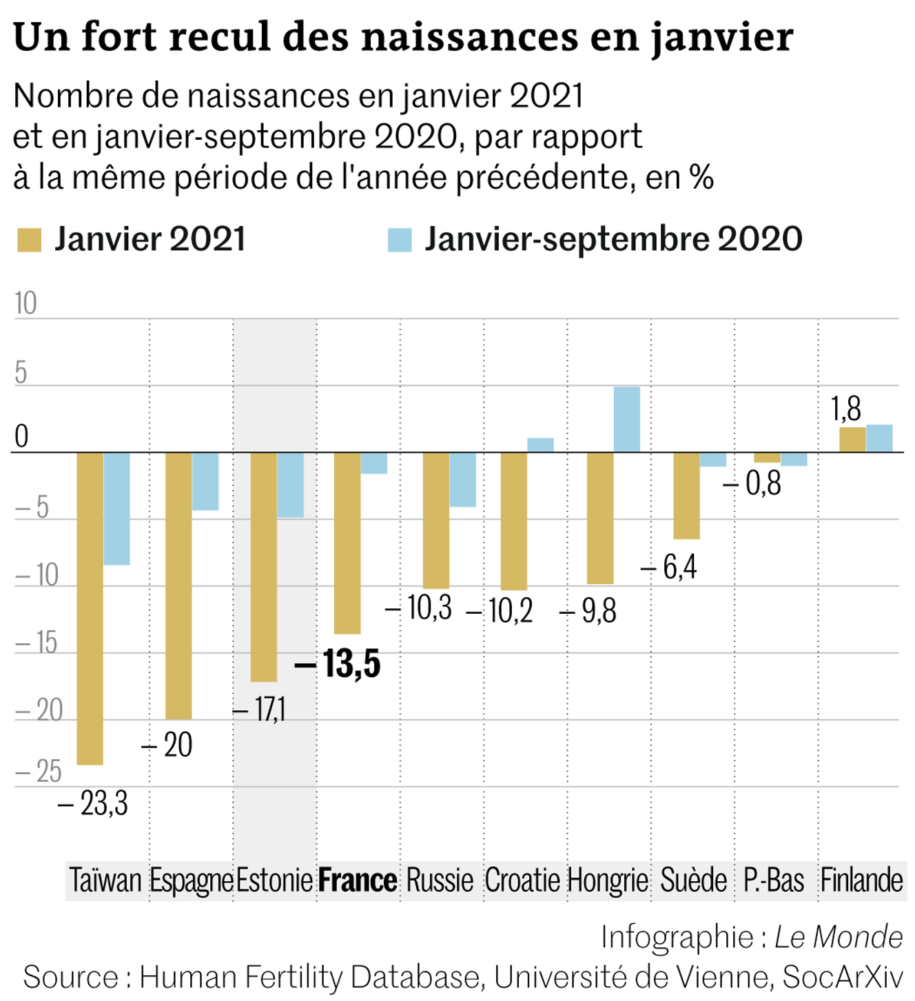 A partir de la base de données sur la fertilité humaine des instituts de démographie de l’université de Vienne, en Autriche, et de Max-Planck en Allemagne, Tomas Sobotka et son équipe de chercheurs se sont penchés sur les derniers chiffres rendus publics par 34 pays. Ils soulignent que chez quinze membres de l’Union européenne, la natalité plonge en moyenne de 3 % en octobre, 5 % en novembre, puis de 8,1 % en décembre 2020 (les données que nous rapportons sont systématiquement indiquées par rapport à l’année précédente ou à la période correspondante un an plus tôt). Avec des chutes en janvier 2021 de 10,3 % en Russie, 23,3 % à Taïwan entre autres, « les spéculations initiales sur un éventuel baby-boom se sont largement dissipées », écrivent les auteurs de cette étude. Ils pronostiquent un effet « baby flop » en 2020, suivi d’un « baby crash » en 2021 en Europe, dans l’est de l’Asie et aux Etats-Unis.