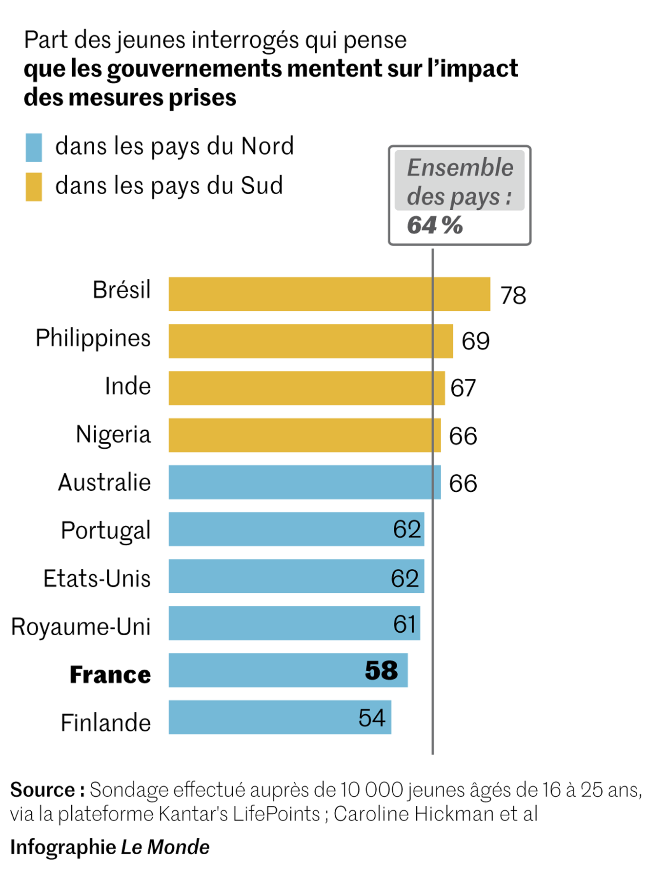 La détresse des jeunes n’est pas seulement liée à la crise environnementale, « mais aussi à l’échec des plus puissants – les adultes et les gouvernements – à y répondre », note Caroline Hickman. Ainsi, 65 % des sondés estiment que les gouvernements manquent à leurs devoirs concernant les jeunes, 64 % jugent qu’ils mentent, 58 % se sentent trahis. Moins d’un tiers des 16-25 ans ont l’impression que les gouvernements les protègent « eux, la planète et/ou les générations futures », qu’ils peuvent faire confiance aux dirigeants et que ces derniers « font assez pour éviter la catastrophe » et prennent leur inquiétude « au sérieux ». Les Français, s’ils sont un peu moins pessimistes que la moyenne, s’avèrent en revanche plus critiques que leurs voisins vis-à-vis du gouvernement.