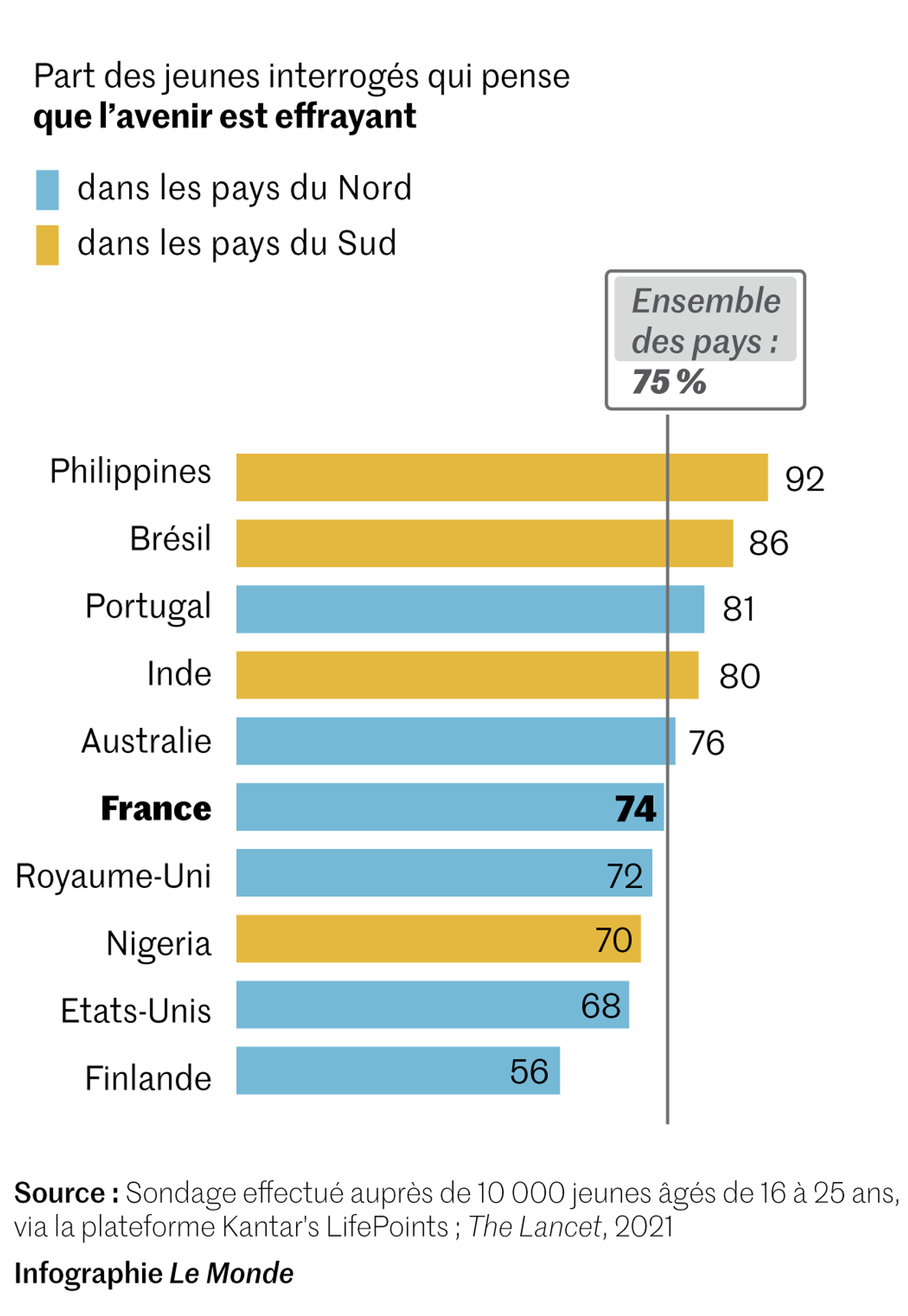 Pire, 75 % jugent le futur « effrayant », 56 % estiment que « l’humanité est condamnée », 55 % qu’ils auront moins d’opportunités que leurs parents, 52 % que la sécurité de leur famille « sera menacée » et 39 % hésitent à avoir des enfants. Plus de la moitié des sondés déclarent se sentir apeurés, tristes, anxieux, en colère, sans défense ou coupables. Moins de 30 % se définissent comme optimistes.