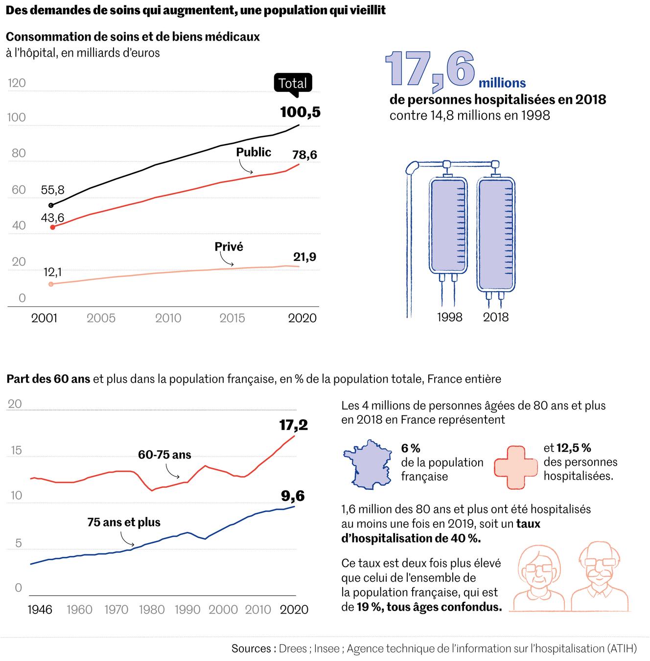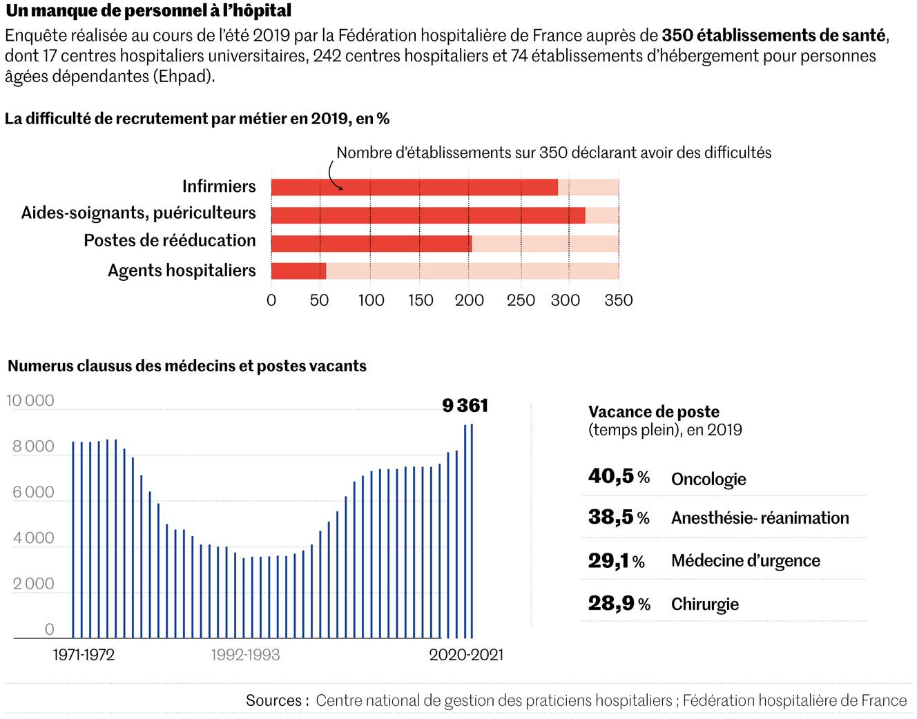 Pièce maîtresse du système de santé, l’hôpital souffre aussi des non-réformes des dernières décennies. La permanence des soins (nuit, week-end) s’est concentrée toujours plus entre ses murs, à mesure que les « déserts médicaux » ont progressé en médecine de ville. Aujourd’hui, 30 % des postes de praticiens sont vacants, particulièrement dans les spécialités où cette permanence de soins pèse le plus lourd et qui se trouvent dans la concurrence la plus forte avec le secteur du privé, comme l’anesthésie.