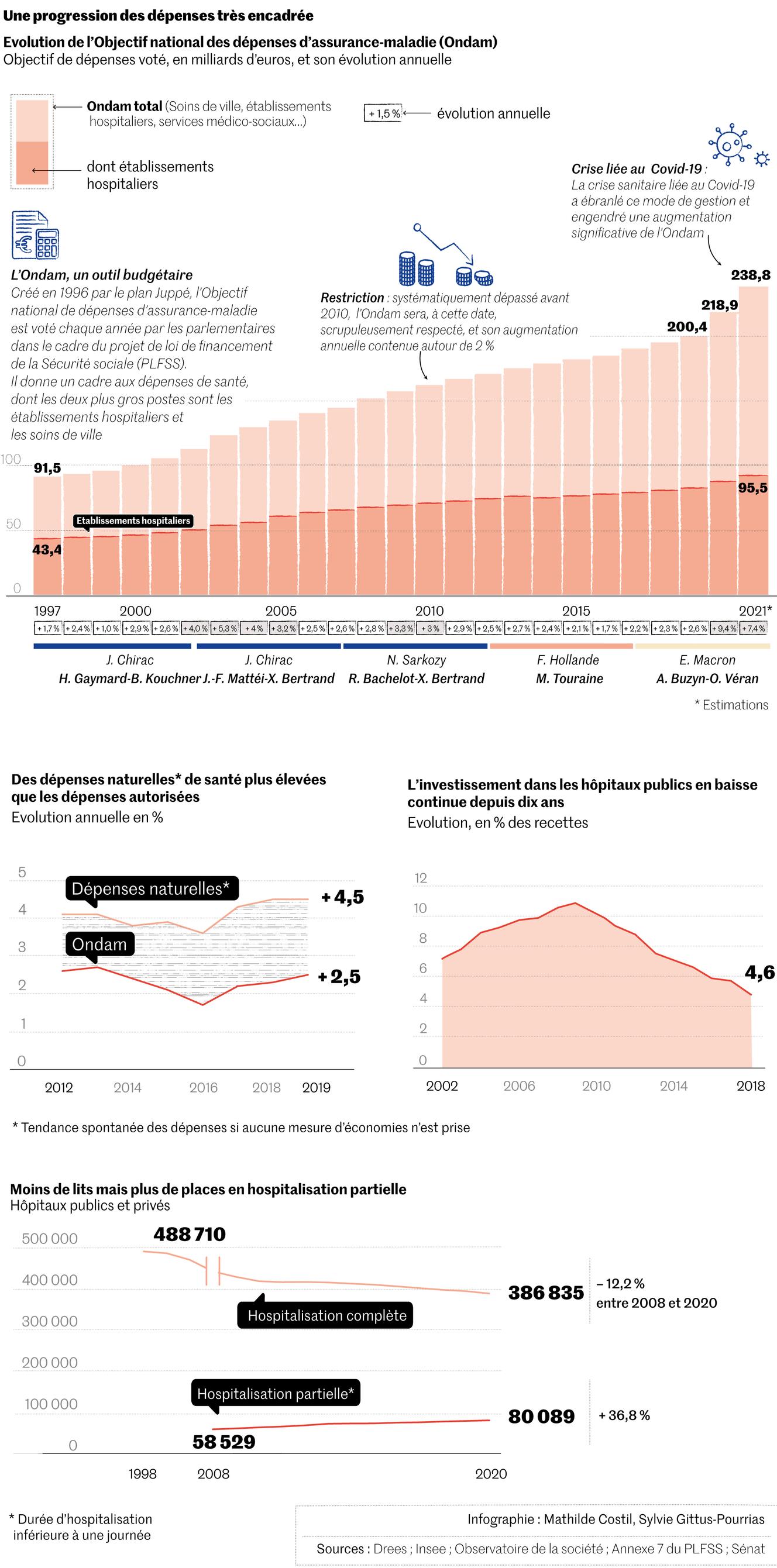 A partir de 2010, l’étau de l’Ondam, créé à la fin des années 1990, va se resserrer plus nettement. Plus question de dépasser l’enveloppe. Chaque année, le gouvernement affiche certes un objectif en progression de 2 % à 3 % pour le système de santé, mais les besoins, évalués au sein même des documents budgétaires du projet de loi de finances de la Sécurité sociale, exigeraient au minimum de 4 % à 5 % d’augmentation.